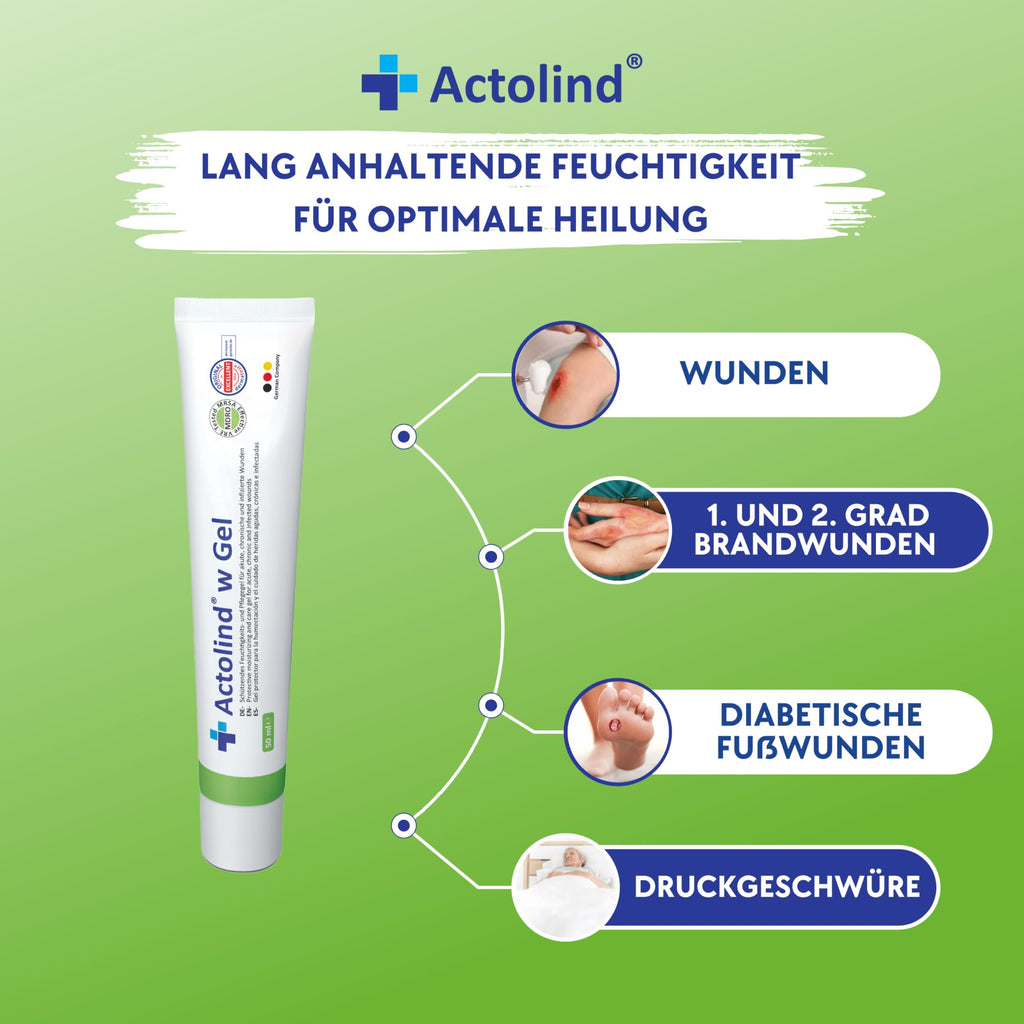 • Actolind w Gel ist ein schützendes Befeuchtungs- und Pflegegel, das in Verbindung mit medizinischen Geräten wie Verbänden, Wundauflagen, Pads und Wundfüllern bei akuten oder chronischen Wunden sowie Verbrennungen ersten und zweiten Grades verwendet wird.