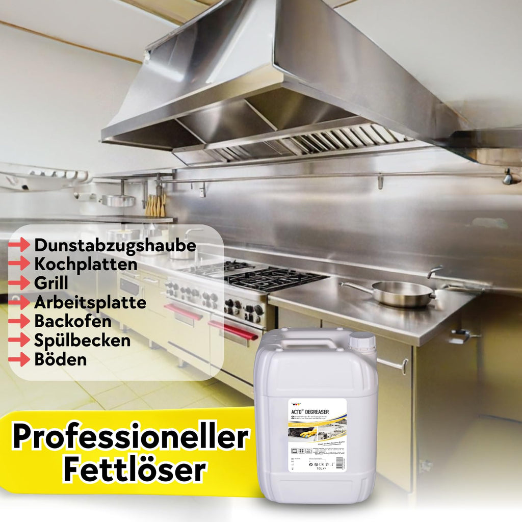 ACTO DEGREASER ist ein hochwirksamer, gebrauchsfertiger Reiniger und Entfetter, der selbst hartnäckige Öl-, Fett- und Lebensmittelflecken mühelos entfernt. Ideal für professionelle Anwendungen in Küche, Gastronomie, Industrie und Werkstatt.