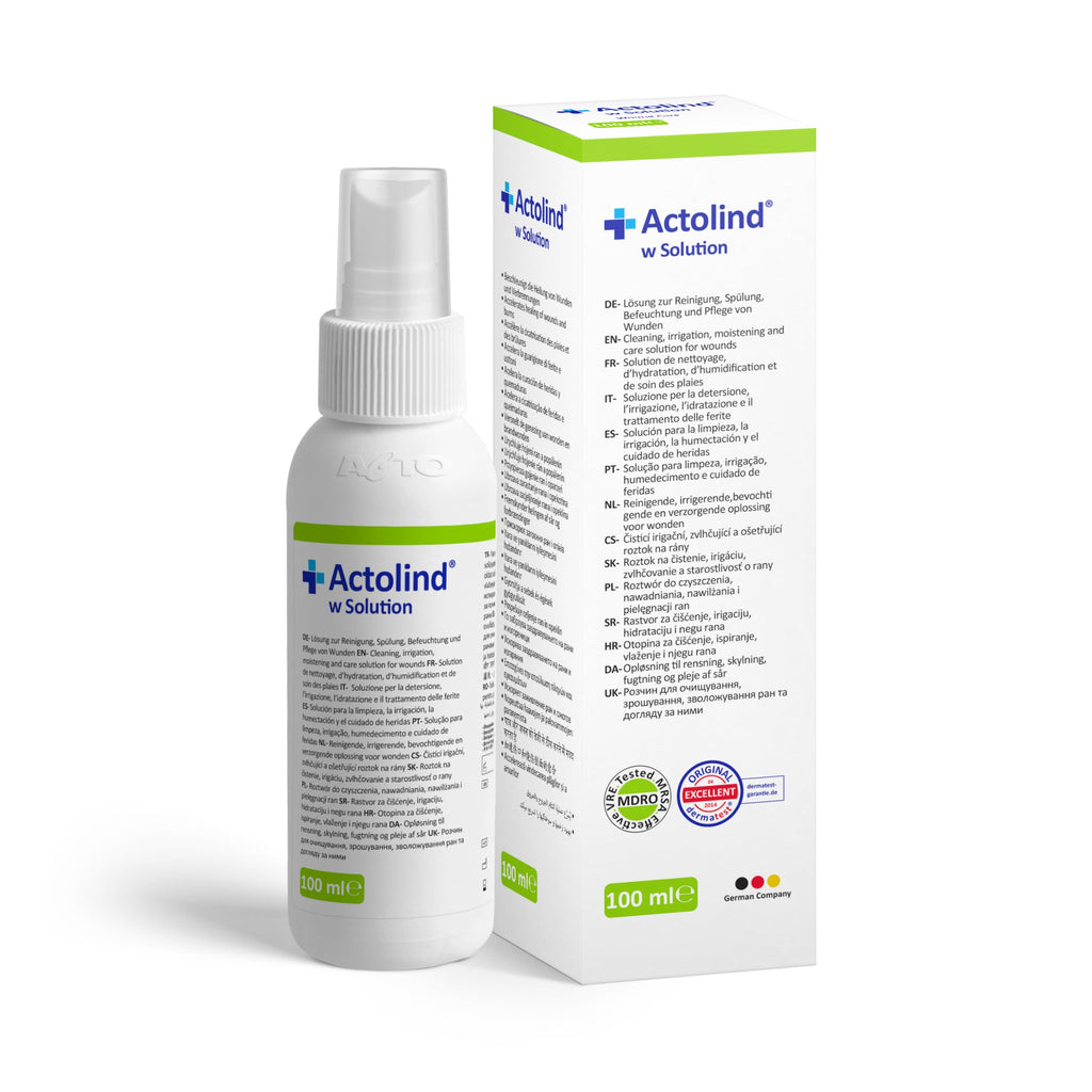 • Actolind w Solution ist eine Lösung zur Reinigung, Spülung, Befeuchtung und Pflege, die zusammen mit Materialien wie Bandagen, Verbänden, Wundauflagen und Wundfüllern auf akuten, chronischen und infizierten Wunden sowie bei Verbrennungen ersten und zweiten Grades verwendet wird. Es ist ebenfalls geeignet zur antiseptischen Reinigung, Einweichung und Entfernung von Verbandstoffen, die getrocknet sind und der Wunde anhaften, ohne ein sekundäres Trauma zu verursachen.