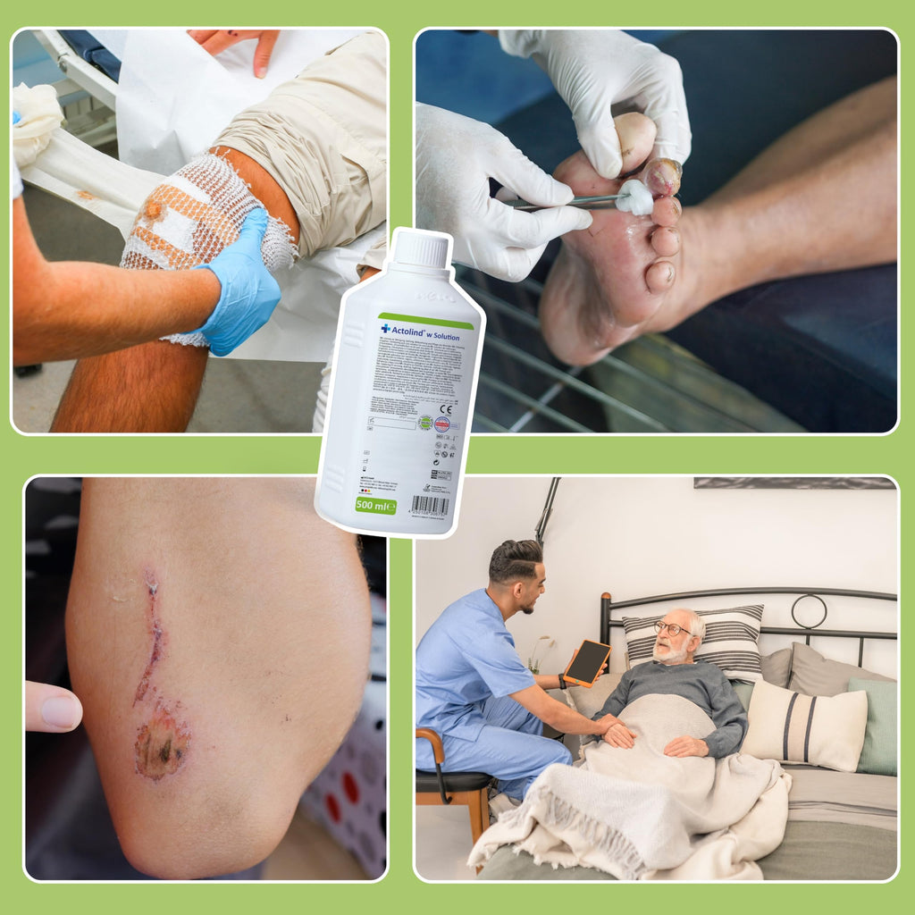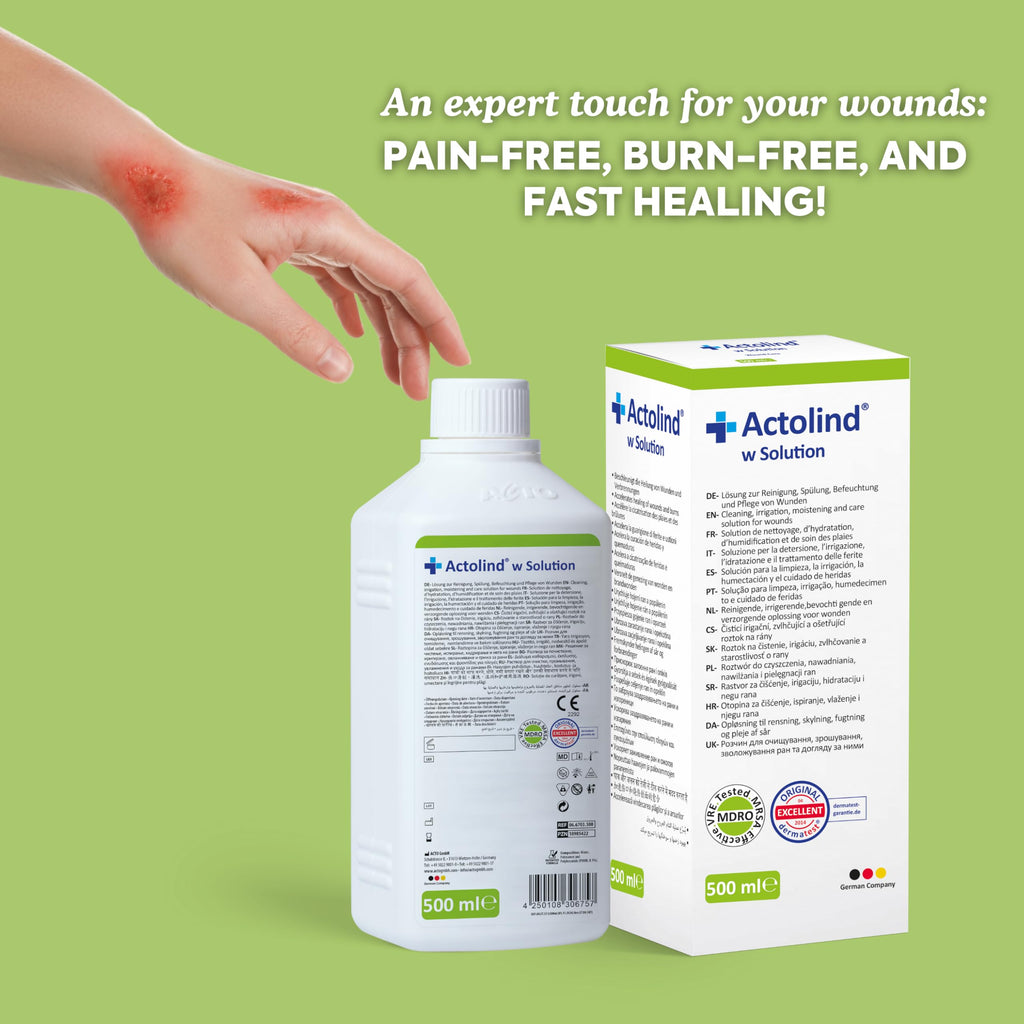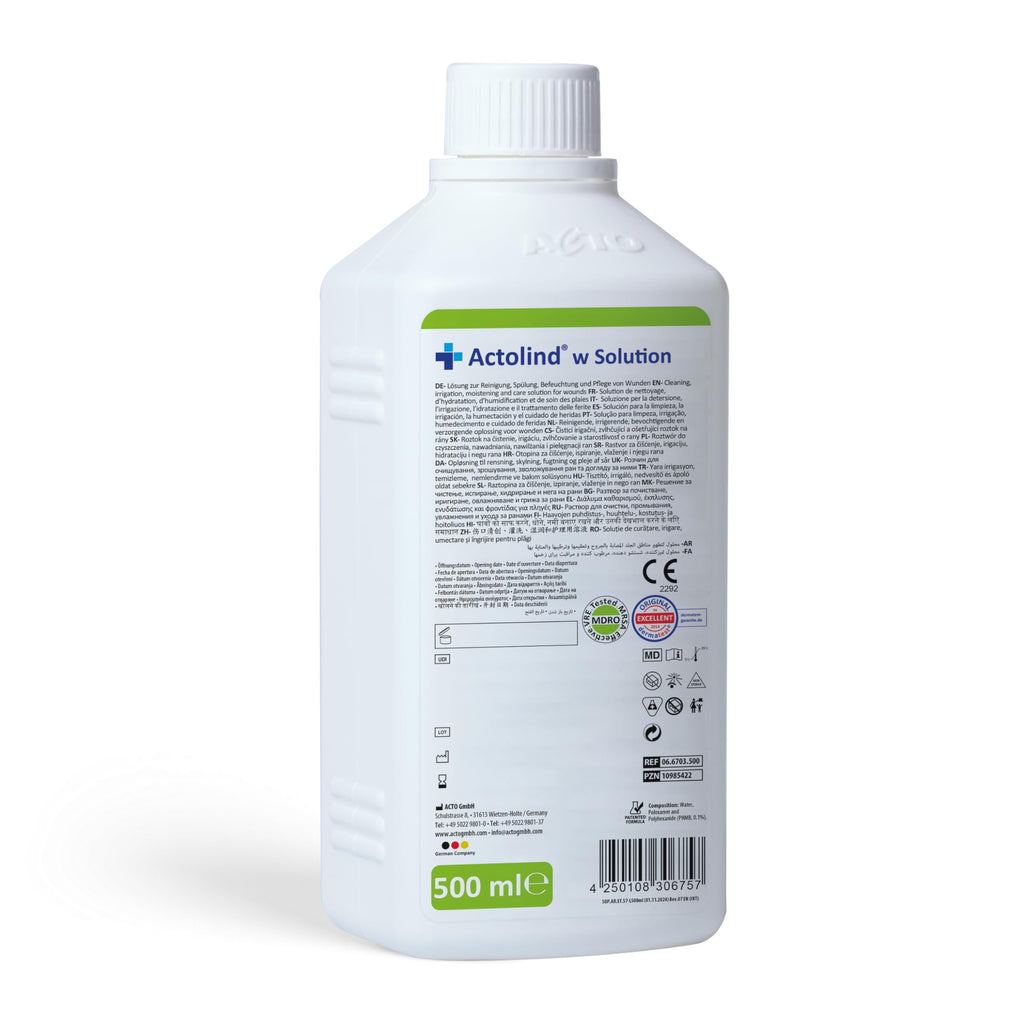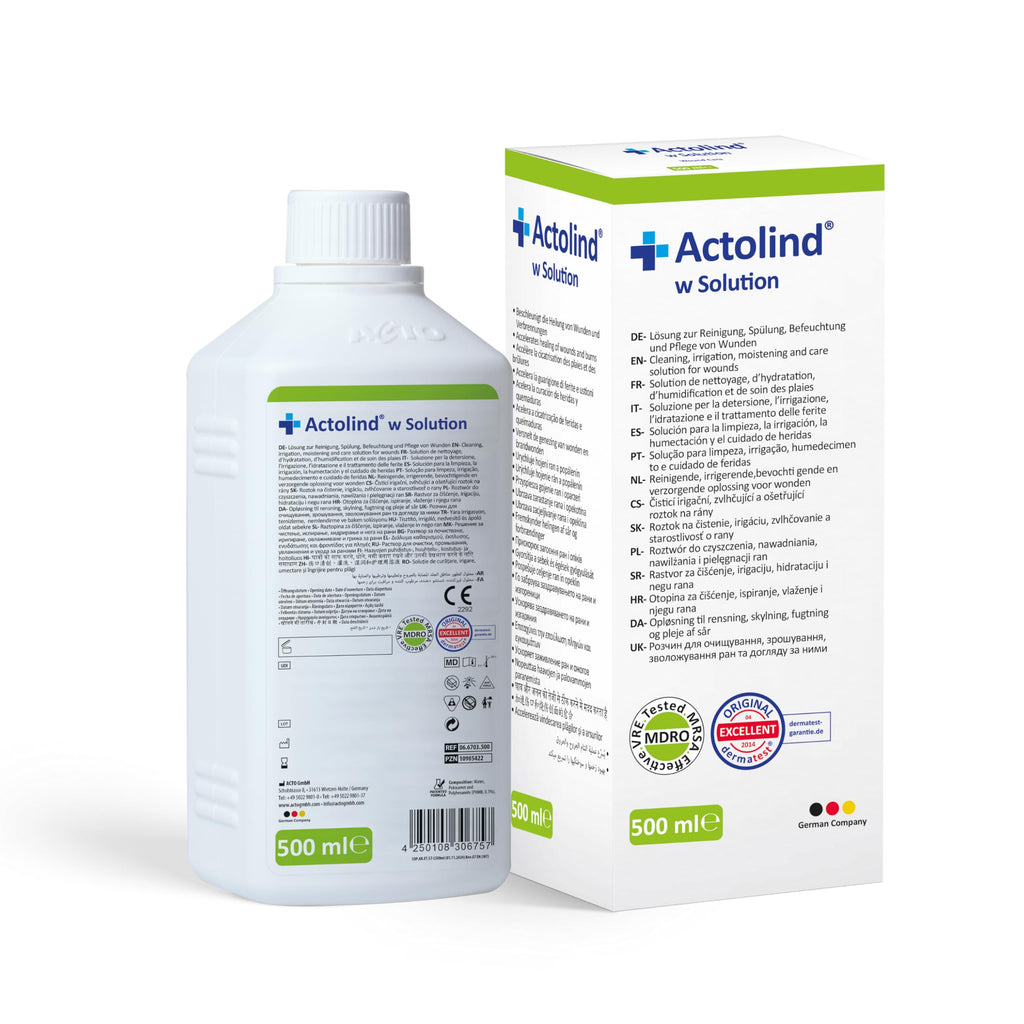 • Actolind w Solution ist eine Lösung zur Reinigung, Spülung, Befeuchtung und Pflege, die zusammen mit Materialien wie Bandagen, Verbänden, Wundauflagen und Wundfüllern auf akuten, chronischen und infizierten Wunden sowie bei Verbrennungen ersten und zweiten Grades verwendet wird. Es ist ebenfalls geeignet zur antiseptischen Reinigung, Einweichung und Entfernung von Verbandstoffen, die getrocknet sind und der Wunde anhaften, ohne ein sekundäres Trauma zu verursachen.