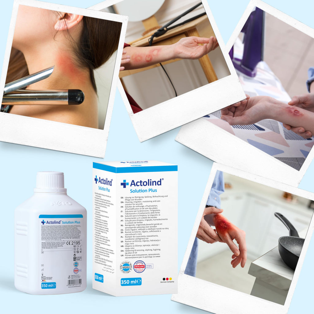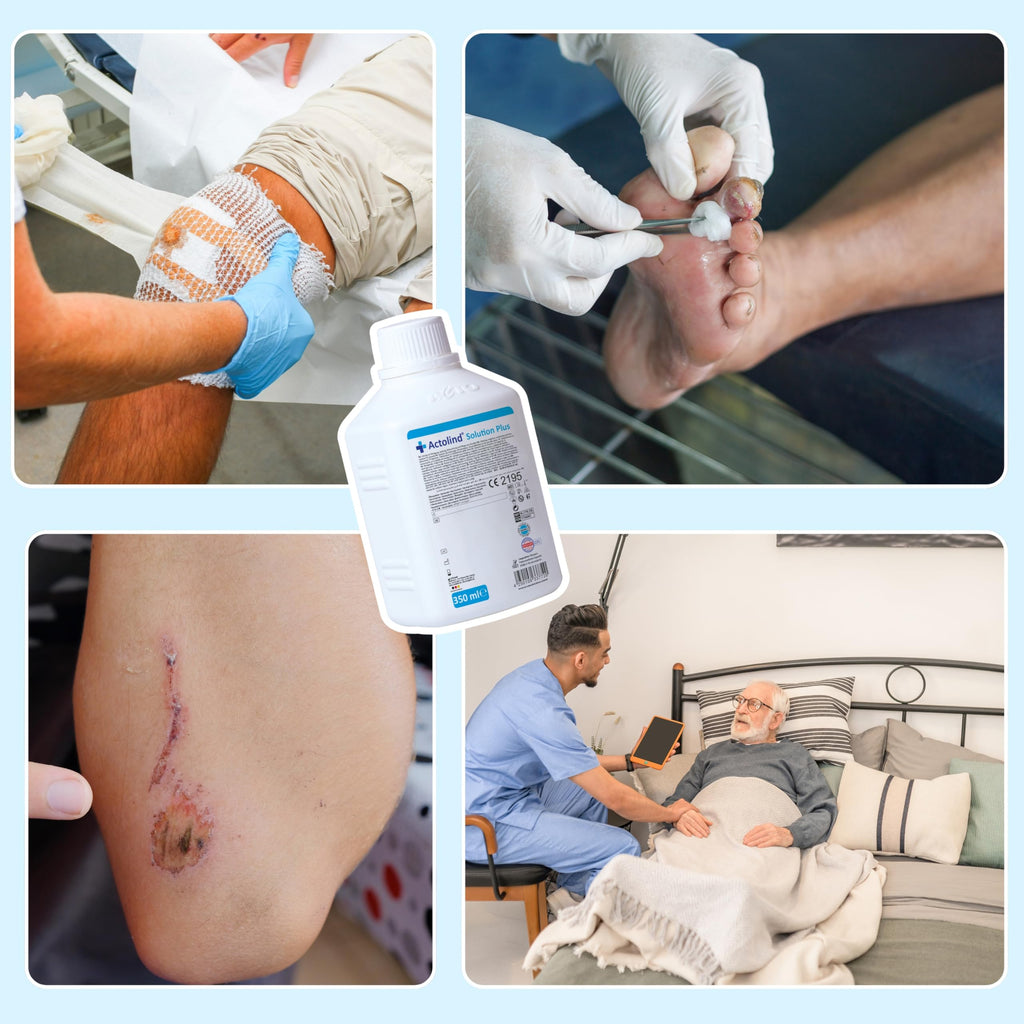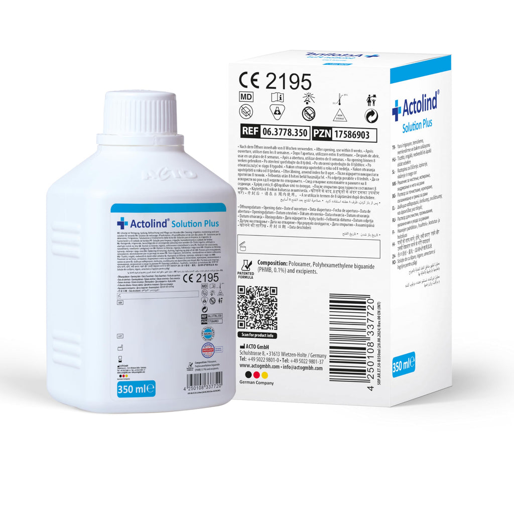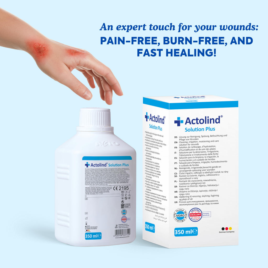 Actolind Solution Plus Dermatologisch getestet. ist eine Lösung zur Reinigung, Spülung, Befeuchtung und Pflege, die zusammen mit Materialien wie Bandagen, Verbänden, Wundauflagen und Wundfüllern auf akuten, chronischen und infizierten Wunden sowie bei Verbrennungen ersten und zweiten Grades verwendet wird. Es ist ebenfalls geeignet zur antiseptischen Reinigung, Einweichung und Entfernung von Verbandstoffen, die getrocknet sind und der Wunde anhaften, ohne ein sekundäres Trauma zu verursachen.